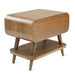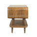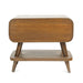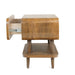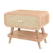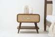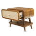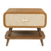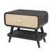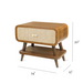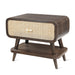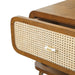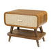 This stylish side table seamlessly blends mid-century modern aesthetics with everyday functionality. Its clean lines and tapered legs create a timeless look, while the handwoven cane front panel adds a unique touch of texture and visual interest. The convenient lower shelf provides additional space for your essentials or favorite décor pieces. This versatile piece is ideal for placing next to a sofa or bed, offering both style and practicality.